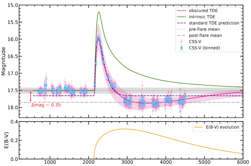 图一: 上图:粉色点表示单次曝光的 CSS V 波段原始数据。蓝色点为分bin后的数据。粉色实线为遮蔽 TDE 模型的最佳拟合结果,粉色阴影区域表示由模型参数不确定性确定的置信区间。作为对比,绿色实线表示去除遮蔽成分后恢复的本征 TDE 光变曲线,紫色虚线表示假设无遮蔽时常规理论 TDE 模型的预测。黑色虚线和灰色带分别表示爆发前星等的均值和标准差,灰色点划线表示爆发后星等的均值,比爆发前暗约 0.35 星等(红色箭头所示)。下图:遮蔽 TDE 模型最佳拟合参数所确定 E(B–V) 的时间演化。