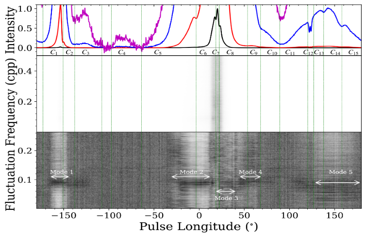 通过分析积分脉冲轮廓,研究人员发现,该脉冲星至少呈现15个辐射成分,其成分个数为所有脉冲星中最多的一颗,这对不同的脉冲星射电辐射锥模型提供更加严格地限制。通过分析高信噪比的单脉冲数据,研究人员还发现额外3种新的调制过程,如图2所示,其中Modes 2,4和5首次被认证。