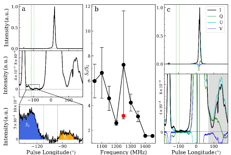 图1、脉冲星B1929+10辐射特征。左边子图显示的是首次发现的两个微弱辐射成分;中间子图描述的是两个微弱成分强度比例随频率演化关系;右边子图对应的是脉冲星B1929+10偏振轮廓特征。其中灰色区域显示的是偏振强度大于总强度,这是由于基线位置估算不准确导致的。